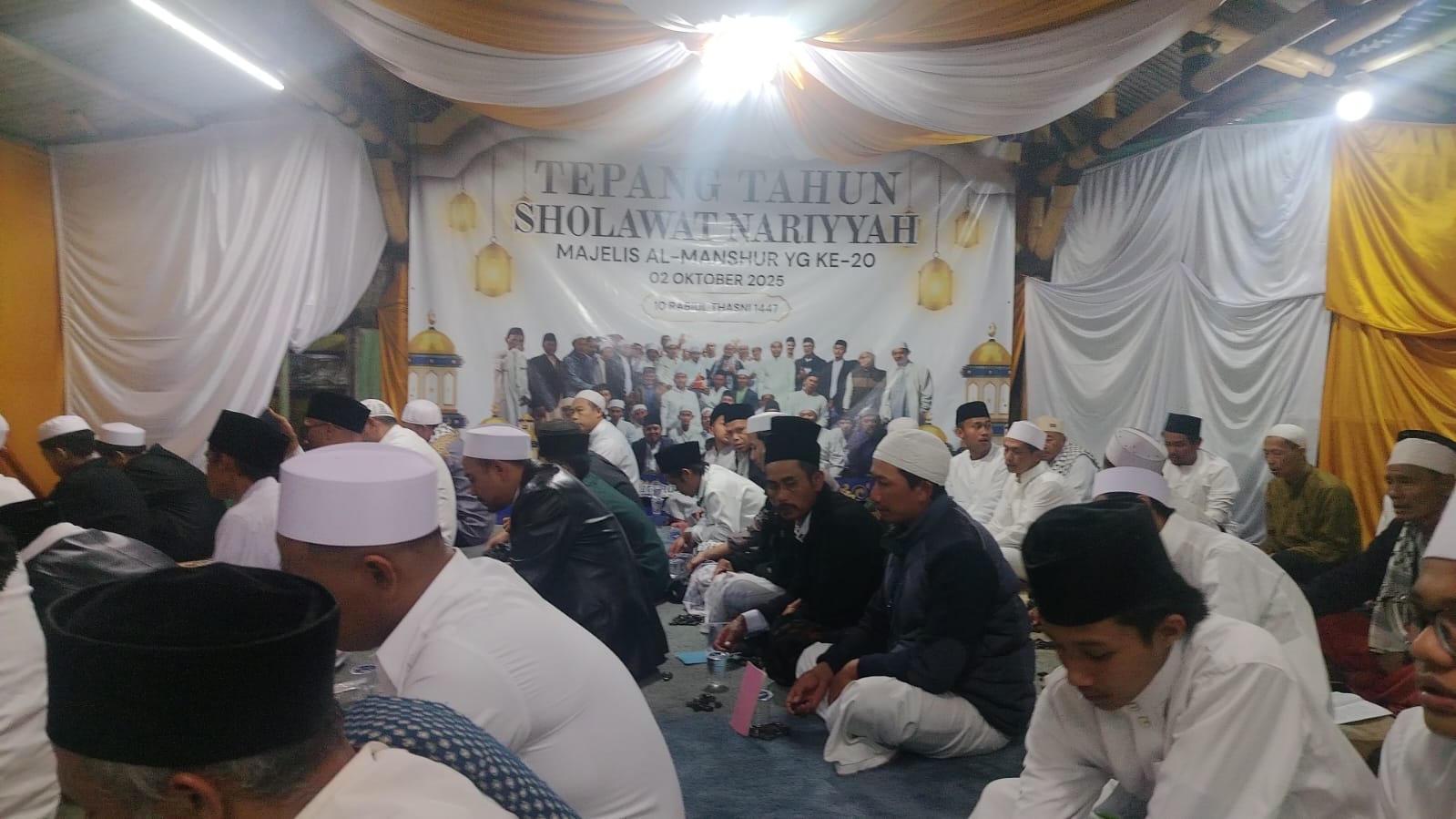 Cisarua – Peringatan Tepang Tahun Sholawat Nariyyah Majelis Al-Manshur ke-20 yang digelar pada Kamis malam (2/10/2025) berlangsung khidmat dan penuh semarak. Acara yang dipusatkan di kawasan Desa Tugu Selatan, kecamatan Cisarua, Kabupaten Bogor ini dihadiri oleh ratusan jamaah, tokoh masyarakat, serta berbagai unsur pemerintahan setempat.
