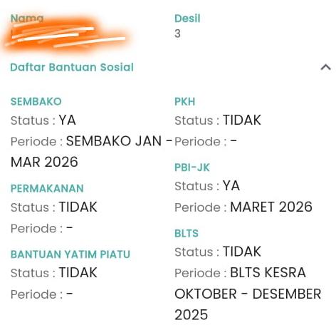 Selain itu, dalam data yang sama, yang bersangkutan juga tercatat sebagai penerima bantuan Penerima Bantuan Iuran Jaminan Kesehatan (PBI-JK) yang aktif pada Maret 2026. Namun demikian, warga tersebut mengaku tidak pernah menerima bantuan sebagaimana tercatat dalam sistem.