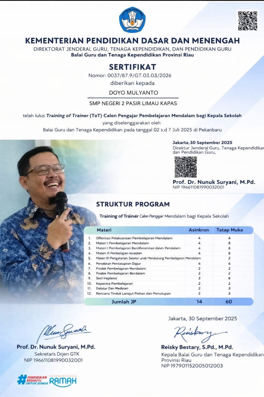 Sertifikat tersebut diterbitkan di Jakarta pada 30 September 2025, dan ditandatangani oleh Direktur Jenderal Guru, Tenaga Kependidikan, dan Pendidikan Guru, Prof. Dr. Nunuk Suryani, M.Pd., serta Kepala Balai Guru dan Tenaga Kependidikan Provinsi Riau, Reisky Bestary, S.Pd., M.Pd.