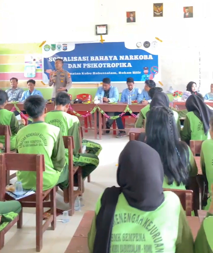 Rokan Hilir | Mahasiswa Kuliah Kerja Nyata (KKN) MBKM dari Universitas Riau (UNRI) telah menyelenggarakan sosialisasi tentang bahaya narkoba dan psikotropika di Kubu Babussalam, Rokan Hilir. Acara ini berlangsung pada hari Selasa, 13 Agustus 2024, di SMK S Sempena dan dihadiri oleh seluruh siswa kelas X, XI, dan XII.