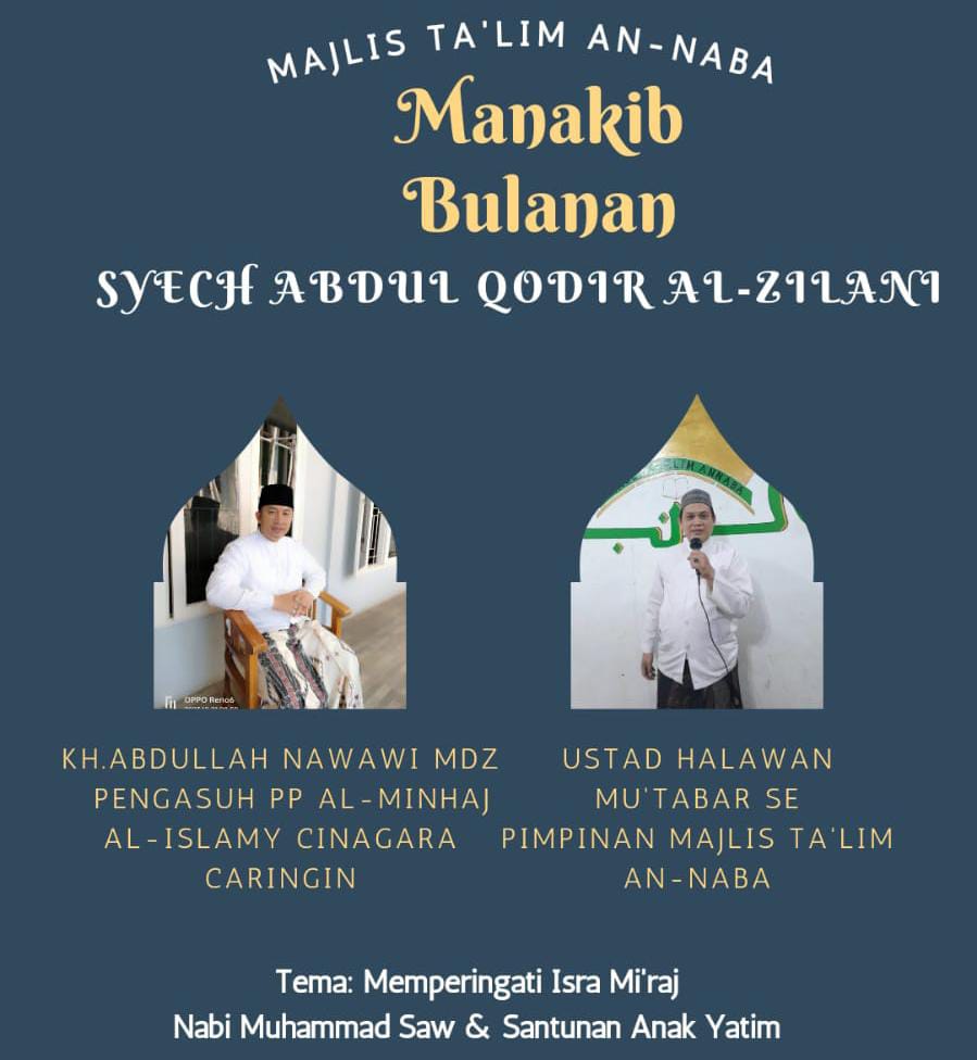 Pada kesempatan yang sama, pimpinan majlis taklim An’Naba, Ustad Halawan Mutabar, SE, menjelaskan bahwa hari ini majlis taklim An-Naba kampung Duren mengadakan manakib bulanan Syekh Abdul Qodir Al-Zilani sekaligus santunan kepada anak-anak yatim yang berada di wilayah kampung Duren. Kegiatan ini dihadiri oleh tokoh agama, tokoh masyarakat, alim ulama, ketua RT, serta para jemaah majlis taklim An-Naba.