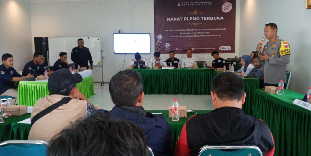 Palapatvnews | Bogor, Bertempat di aula Saung Hijau, Desa Pagelaran, Kecamatan Ciomas Kabupaten Bogor, Jawa Barat pada hari sabtu 17 Februari tahun 2024. Sedang dilaksanakan rapat pleno terbuka rekapitulasi hasil penghitungan suara dan penetapan hasil perolehan suara pada pemilu 2024. tingkat kecamatan Ciomas kabupaten Bogor.