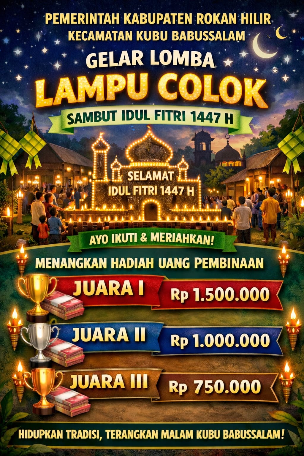 Rokan Hilir – Dalam rangka menyemarakkan Hari Raya Idul Fitri 1447 Hijriah/2026 Masehi, Pemerintah Kecamatan Kubu Babussalam, Kabupaten Rokan Hilir akan menggelar Lomba Lampu Colok (hias) tingkat se-Kecamatan Kubu Babussalam.