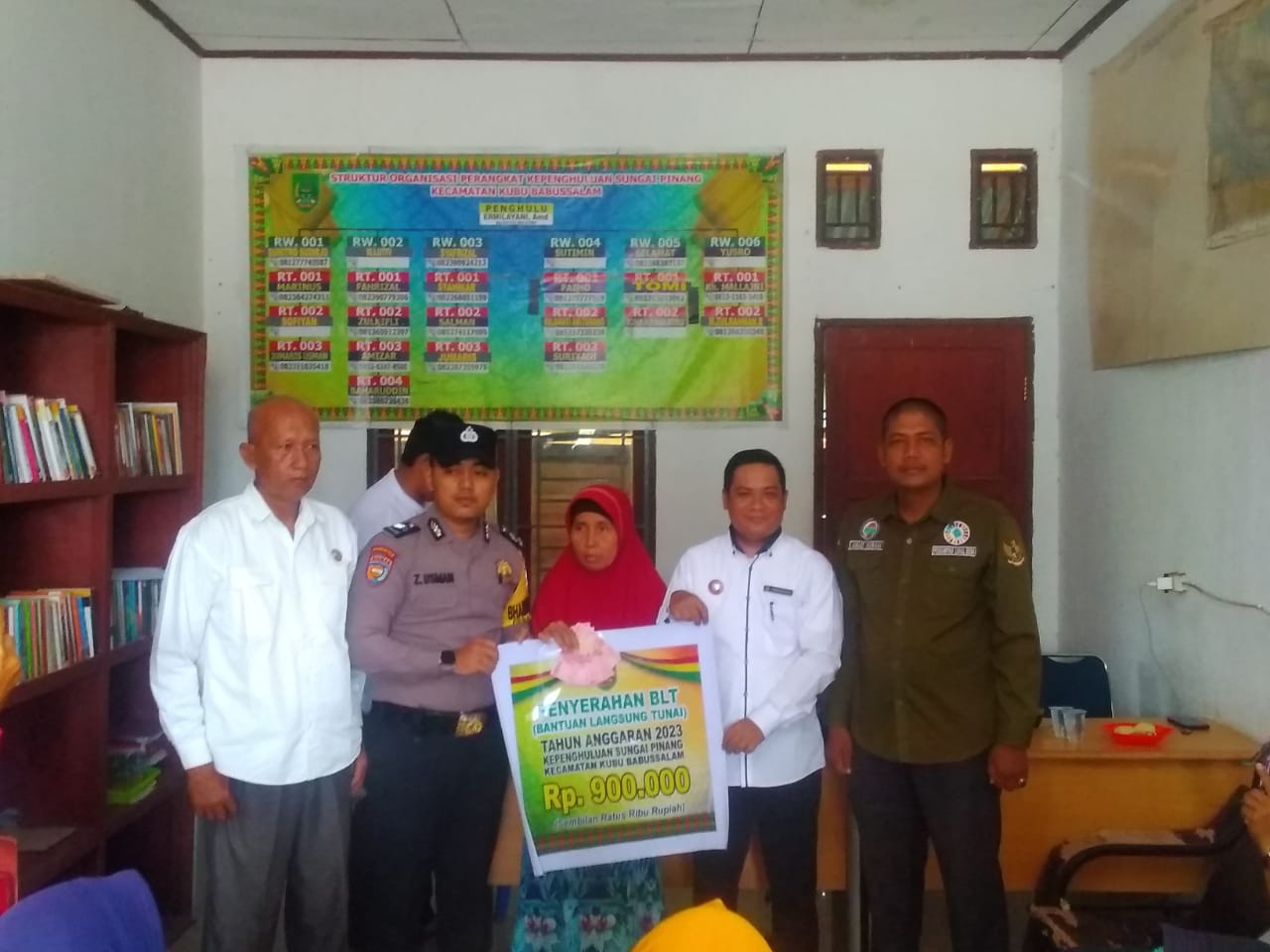 Palapatvnews | Rokan Hilir, Pada Kamis, 29 Desember 2023, di Kepenghuluan Sungai Pinang, Kecamatan Kubu Babussalam, Rokan Hilir, dilakukan penyerahan dana bantuan tunai (BLT) kepada keluarga penerima manfaat (KPM). Acara ini dihadiri oleh datuk penghulu Hidayatullah dari Kepenghuluan Sungai Pinang, bapak Suharno Yahya dari perwakilan kecamatan Kubu Babussalam, serta pendamping desa bapak Ahmad Nurani dan babinkamtibmas bapak Zainudin Usman. Bantuan tunai ini diberikan kepada 60 orang KPM dengan besaran 300 ribu rupiah per bulan selama 3 bulan.