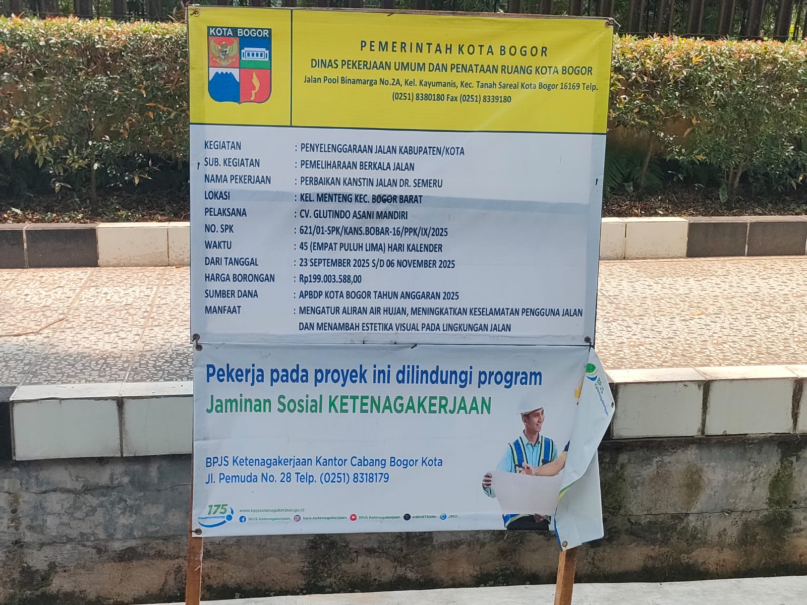Pekerjaan ini dilaksanakan oleh CV Glutindo Asani Mandiri dengan jangka waktu pengerjaan 45 hari kalender, terhitung sejak 13 September hingga 6 November 2025, dengan nilai kontrak sebesar Rp199.003.588,00 yang bersumber dari APBD Kota Bogor Tahun Anggaran 2025.