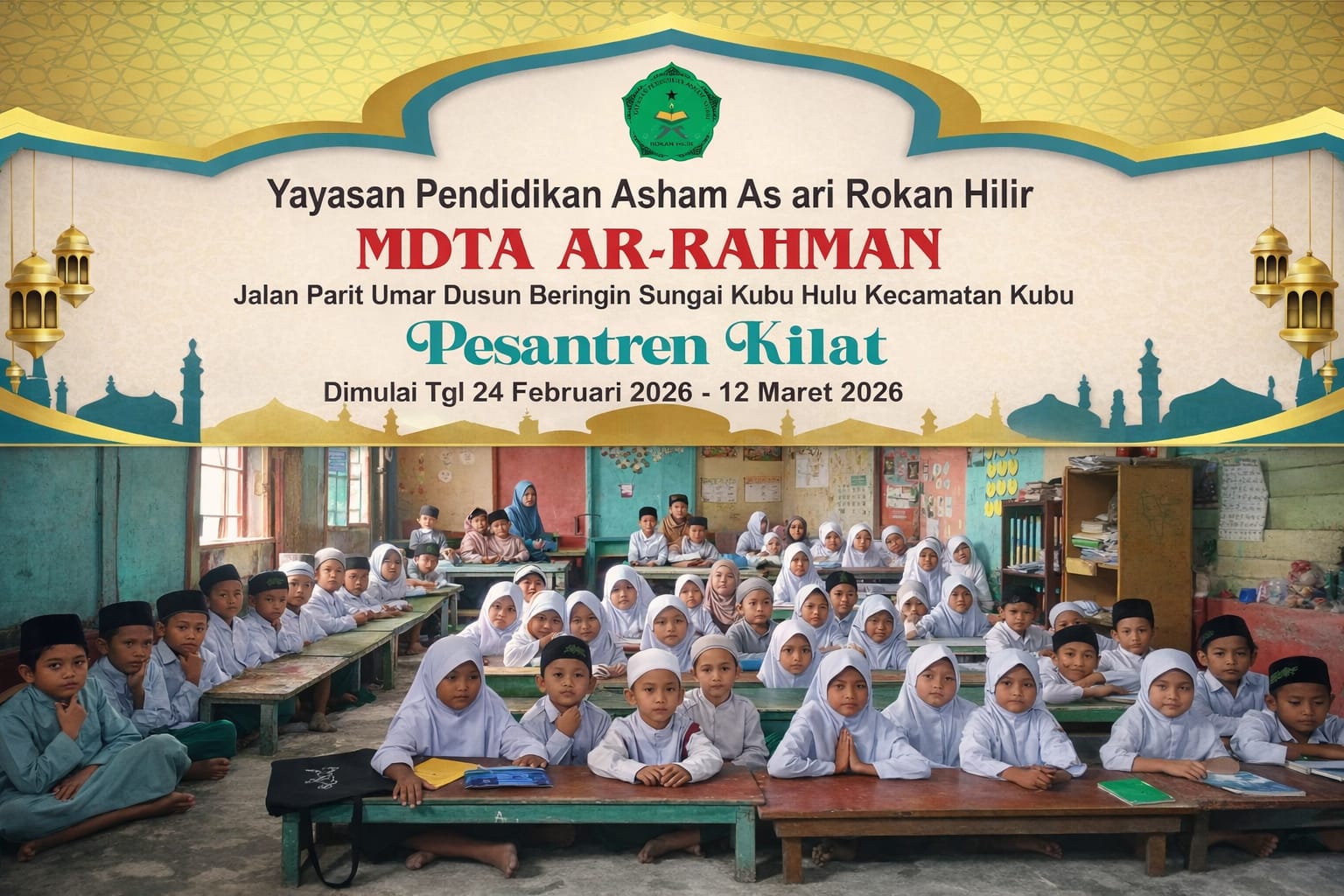 Pesantren Kilat MDTA Ar-Rahman Tahun 2026 diawali dengan pembukaan pada Selasa (24/2/2026). Selanjutnya, kegiatan berlanjut dengan materi aqidah Rasulullah (2/3/2026), fiqih ibadah puasa (3/3/2026), serta praktik fardhu kifayah tentang memandikan jenazah (4/3/2026).