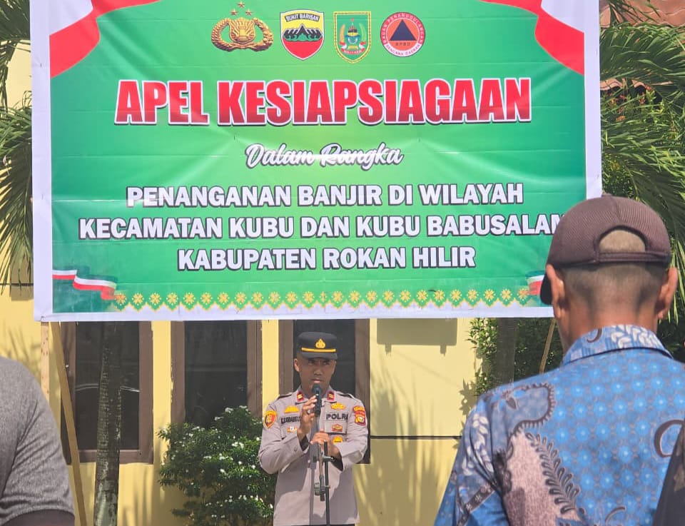 Rokan Hilir, Riau — Polsek Kubu, Polres Rokan Hilir, menggelar apel kesiapsiagaan dalam rangka menghadapi musim hujan dan potensi bencana banjir. Apel tersebut dilaksanakan di lapangan Mapolsek Kubu, Jalan Sudirman, Kepenghuluan Sungai Kubu, Kecamatan Kubu, Rokan Hilir, pada Rabu (15/10/2025).