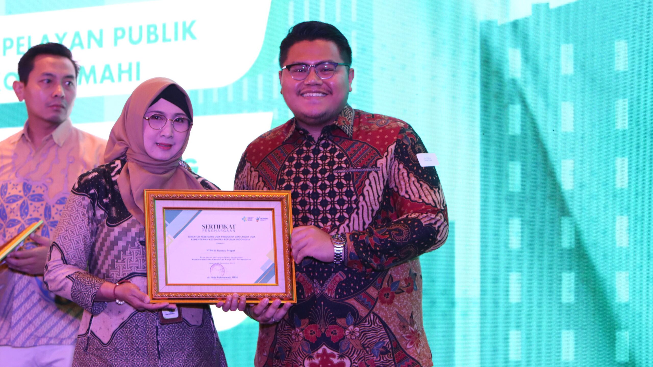 Acara penganugerahan Mitra Bakti Husada ini dihadiri oleh Wakil Menteri Kesehatan RI Bapak Prof. dr. Dante Saksono Harbuwono, Sp.PD-KEMD., Ph.D beserta seluruh jajaran petinggi lembaga. Penghargaan tersebut langsung diserahkan oleh Direktur Kesehatan Usia Produktif dan Lanjut Usia Ibu Dr. Nida Rohmawati kepada PT. Perkebunan Nusantara IV Regional I Kebun Rantauprapat.