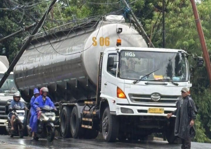 Cigombong — Sebuah truk pengangkut air mineral milik PT Tirta Investama Aqua menyeret kabel PLN yang melintang di Jalan Raya Bohlam, Desa Ciburuy, Kecamatan Cigombong, Kabupaten Bogor, hingga menyebabkan dua tiang listrik roboh, Senin (1/12/2025).
